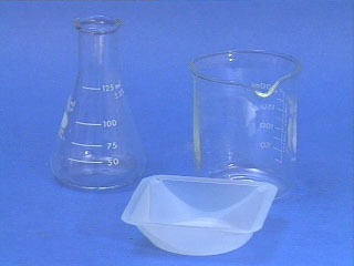 (from upper left: Erlenmeyer flask, beaker, and plastic weighing boat)