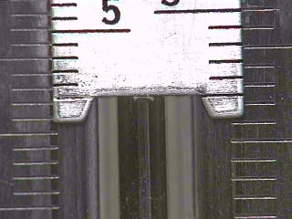 The sliding scale is postioned so that its bottom edge is alined with the meniscus of the mercury in the tube.