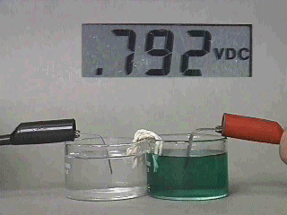 IMAGE. The cell design described in this module includes two solutions connected by salt bridge (piece of string) and two electrodes (metal strips) connected to a voltmeter (not shown)