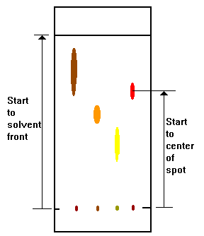 The Rf value for each spot should be calculated. Rf stands for "ratio of fronts", or "retardation factor", and is characteristic for any given compound on the same stationary phase, using the same mobile phase for development of the chromatogram. Hence, known Rf values can be compared to those of unknown substances to aid in their identifications.