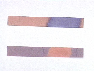 IMAGE. Red and blue litmus paper. Top: Red litmus paper with a drop of base placed on it (where the red paper has turned blue). Bottom: Blue litmus paper with a drop of acid placed on it (where the blue paper has turned red).