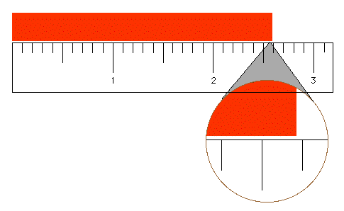 In the example below, the orange solid is between 2.5 and 2.6 cm. However, the solid is clearly not 2.50 or 2.60 cm, and therefore a more accurate length could be recorded. An imaginary linear scale between the two graduation marks can be used to make a more accurate determination of the length. The edge of the solid is approximately 8/10 of the way between the 2.5 and 2.6 graduation marks. So, the uncertain digit is an "8", and the length to be recorded for the solid is 2.58±0.01 cm. The use of the "±" symbol indicates the uncertainty in the last digit.