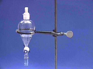 IMAGE. Separatory funnel supported in a ring stand.